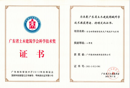 2021年8月20日,第九届广东省土木建筑学会科学技术奖优秀项目技术交流会在广州召开,我司总经理雷德意先生应邀出席了会议。会议上揭晓了2021年广东省土木建筑学会第九届科学技术奖获奖项目,我司的“全自动管桩智能化生产线设计与应用”项目获得广东省土木建筑学会科学技术二等奖。