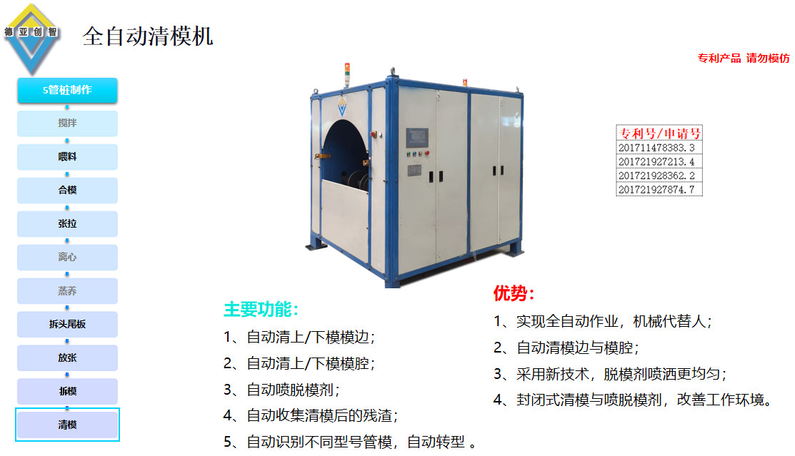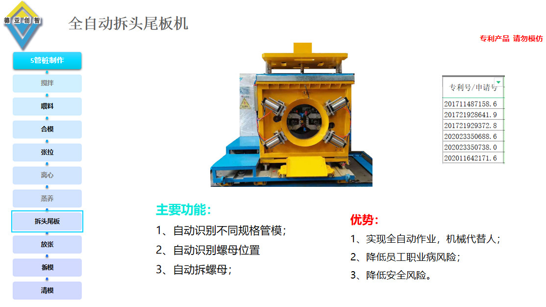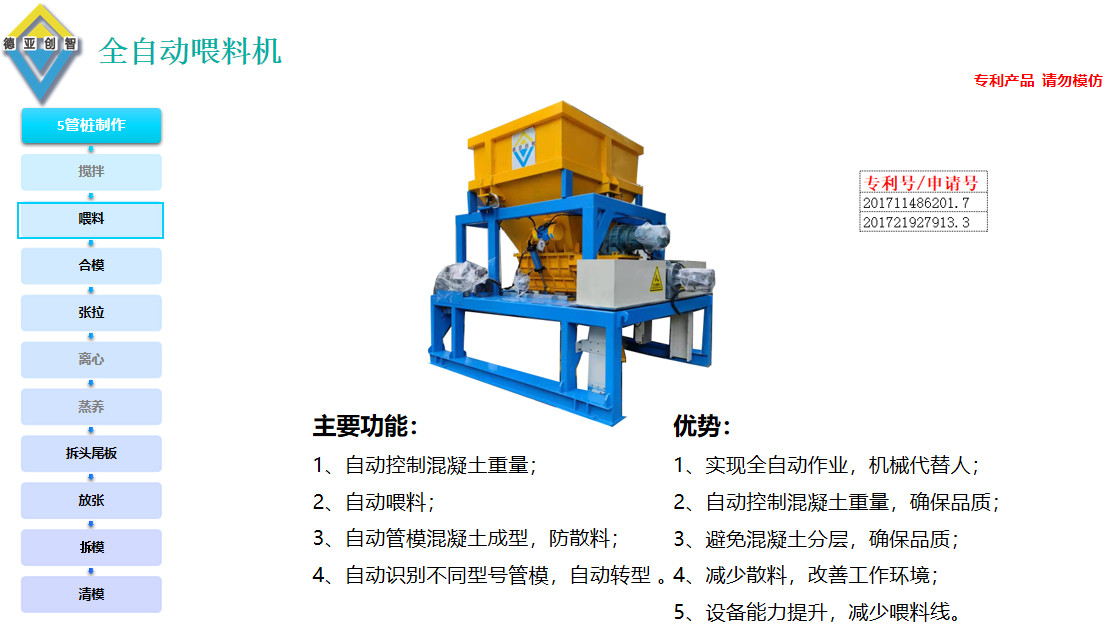 为配套“光伏桩”的应用,同时针对“光伏桩”直径小、规格跨度小等特点,公司先后研发出一系列经济实用的专用设备:全自动裙板一体机、全自动喂料机、全自动合模机、全自动张拉机、全自动拆模机、全自动放张机、全自动拆头尾板机、全自动清模机等;按智能程度分为半自动、全自动;以满足不同客户的需求,为PHC管桩在光伏产业中的应用保驾护航。