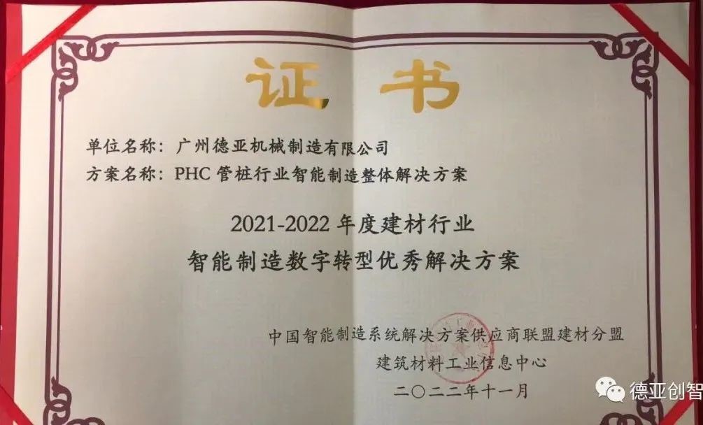 本次大会以“数字赋能、智驱未来”为主题,贯彻落实工信部《建材工业智能制造数字转型行动计划(2021—2023年)》。2023年是《建材工业智能制造数字转型行动计划(2021-2023年)》收官之年,经建筑材料工业信息中心、中国智能制造系统解决方案供应商联盟建材行业分盟组织专家层层评审,我司申报的“PHC管桩行业智能制造整体解决方案”获得“2021-2022年建材行业智能制造数字转型优秀解决方案”。