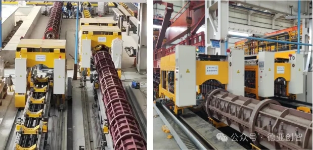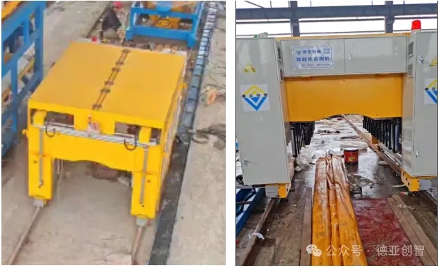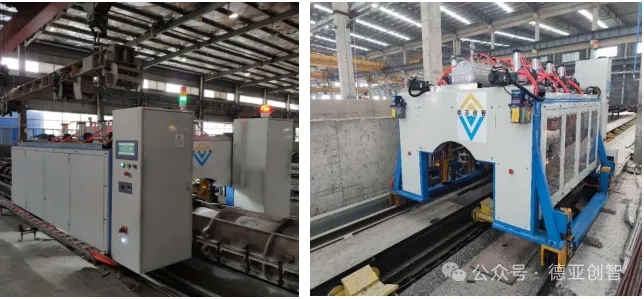 4.1 跟随合/拆模机,特点:合/拆模机跟随管模同步行走时合模拆模作业,管模不用停止,生产效率高,能满足单线模式生产节拍,投资成本低,目前为新工厂首选;